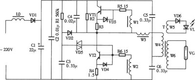 同时,发光二极管VD7也点亮工作。 元器件选择 VTl、VT2选用2SC2653或BU406型硅NPN高反压三极管。要求电流放大系数β>100。 VDl一VD4、VD6选用1 N4007型整流二极管;VD5选用DB3型双向触发二极管。 R1一R6全部选用RJ一1/8W型金属膜电阻器。 L0为5mH的磁心电感线圈,可用Φ0.25mm的漆包线在骨架上绕210匝;L1一璐用Φ0.2mm的单心塑铜线在同一磁环上绕制而成,其中L1、L2分别绕3匝,L3绕9匝。脉冲变压器T可使用14in(英寸)黑白电视机行输出变压器改制,改制时用高压包作为L6,在低压包骨架上用Φ0.45mm的漆包线绕168匝作为L4,用Φ0.23mm的漆包线绕4匝作为L5(在最外层绕制)。 臭氧发生片VG选用Z二10或Z一15、Z一20等型号。 制作与调试 除臭氧发生片VG外所有电子元器件安装在一块自制的印制电路板上,并将其装人大小合适的塑料或木制盒内。在盒面开孔固定发光二极管VD7,接上臭氧发生片VG,只要元器件良好、接线无误,通电即能正常工作。