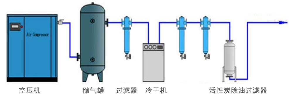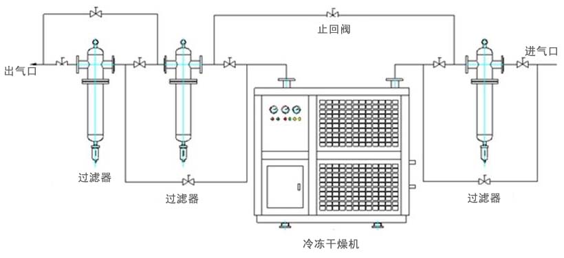 冷冻干燥机由换热机组、制冷机组、电气控制单元组成。在压缩空气干燥过程中,其冷冻干燥是通过降低压缩空气温度,使压缩空气中的水份析出。冷冻干燥机(冷干机)的工作原理与电冰箱一样,压缩空气经过冷冻的压缩空气管道后,压缩空气温度下降至要求的温度,达到干燥的要求。冷冻干燥机的制冷系统属于压缩式制冷,它们之间用管道次连接,形成一个密闭的系统,制冷剂在系统中不断地循环流动,发生状态变化并与压缩空气和冷却介质进行热量交换。